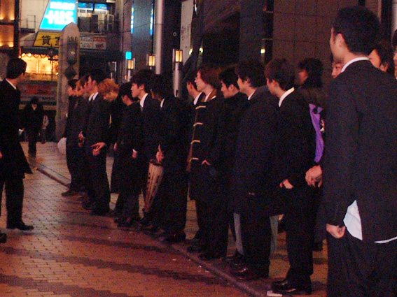 On the Ebisu-bashi bridge stood two small lines of young men, dressed smartly in black designer suits and ties.