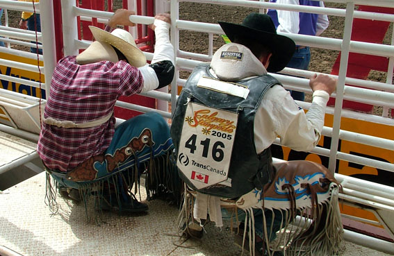 Behind the chutes, a cowboy stand quietly, preparing for action. He looks at the horse he has been given, drawn in a random lot, trying to take its measure. Will it win him a fortune (points are scored for the horse’s performance, as well as the riders)? Or kill or maim him? Only the top riders can make a living, touring the rodeos around North America. Many are working ranch-hands, just taking part in the sport they love best. A moment of prayer, the roar of the crowd as another rider bucks across the arena strangely muted. Then it’s on with the protective waistcoat, a pat of the horse’s neck before the explosive release of tension as the bronco bucks wildly into the arena in front of 18,000 cheering spectators.